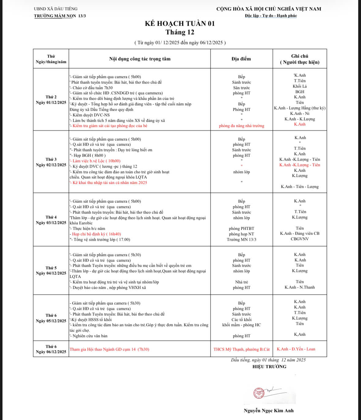 Lịch Làm việc của BGH nhà trường (Từ ngày 01/12/2025 Đến ngày 06/12/2025)
