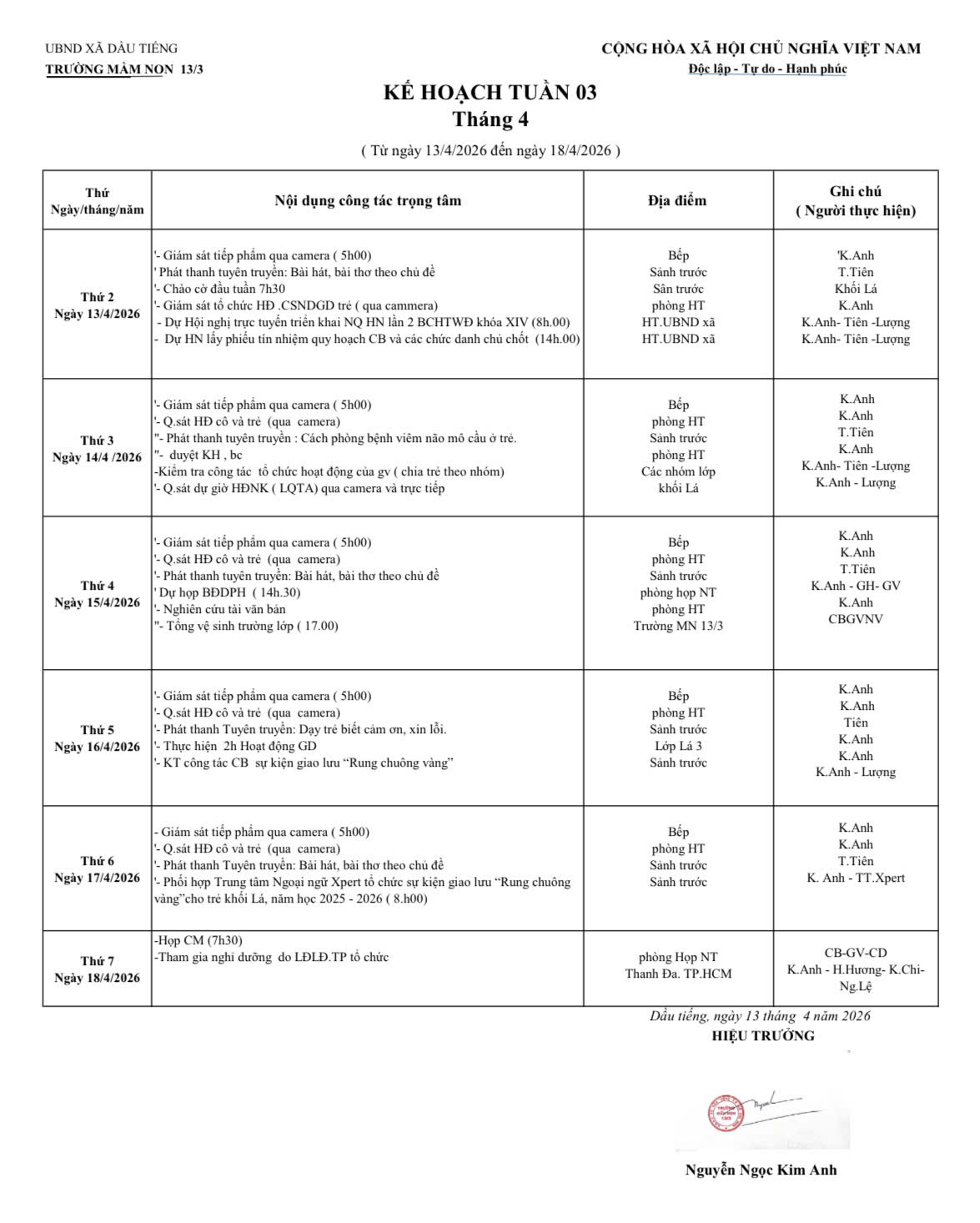 Lịch Làm việc của BGH nhà trường (Từ ngày 13/4/2026 Đến ngày 18/4/2026)