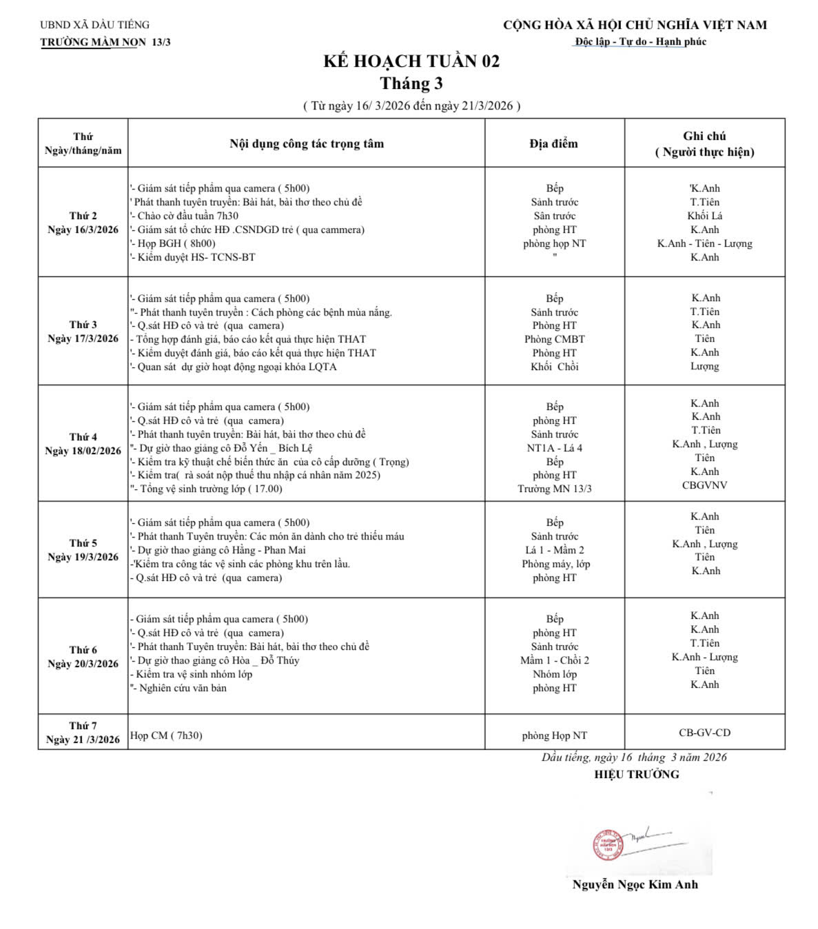Lịch Làm việc của BGH nhà trường (Từ ngày 16/03/2026 Đến ngày 21/03/2026)