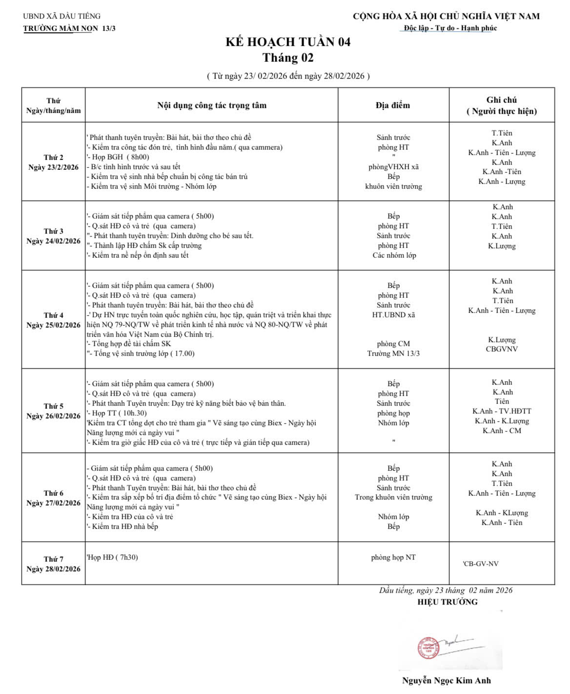 Lịch Làm việc của BGH nhà trường (Từ ngày 23/02/2026 Đến ngày 28/02/2026)