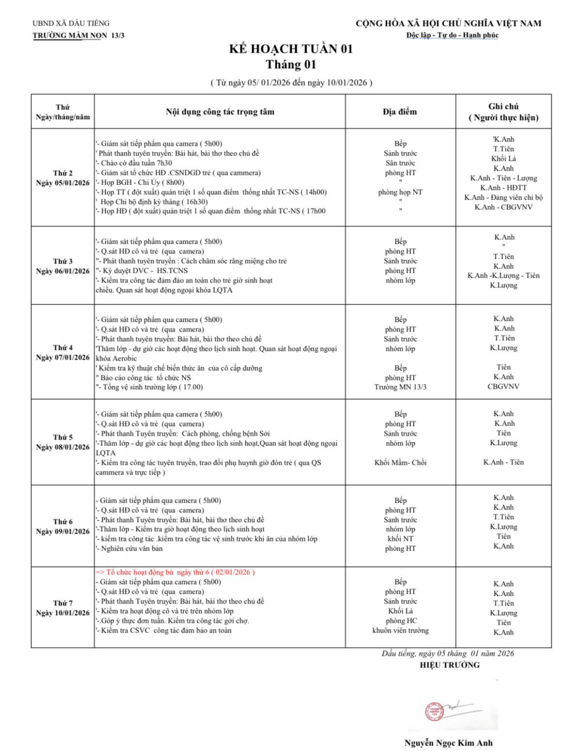 Lịch Làm việc của BGH nhà trường (Từ ngày 5/01/2026 Đến ngày 10/01/2026)