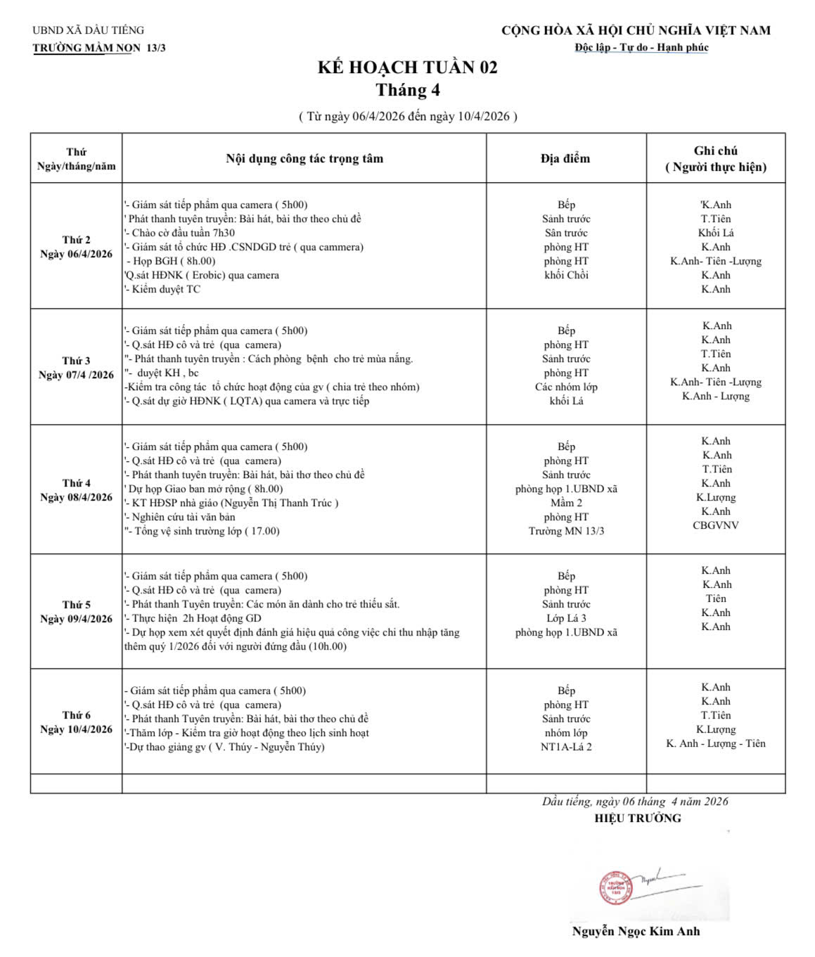 Lịch Làm việc của BGH nhà trường (Từ ngày 6/4/2026 Đến ngày 10/4/2026)